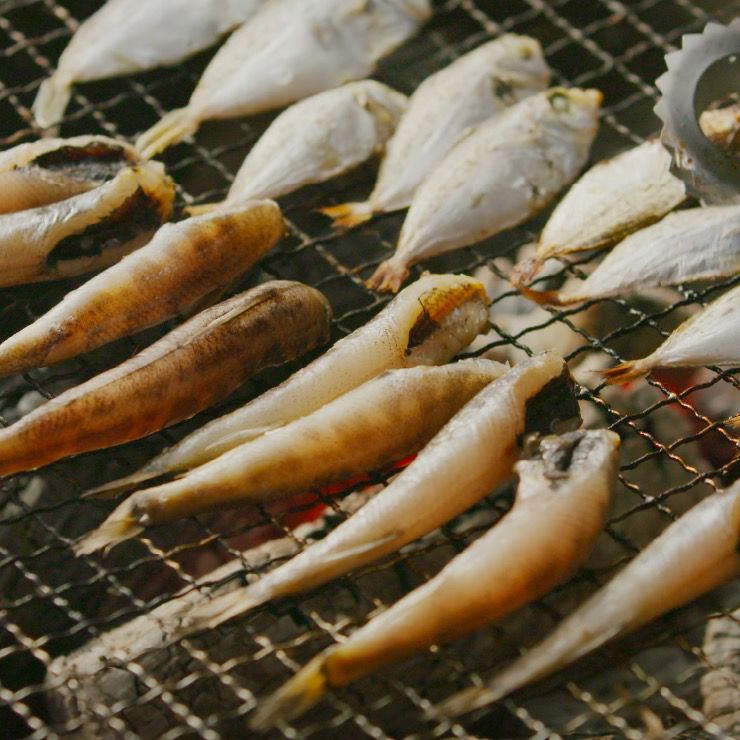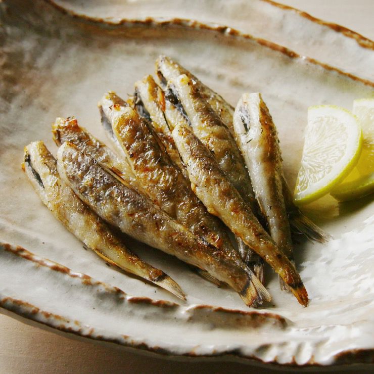 メヒカリという魚は深海魚で目が大きくてエメラルドグリーンに光ることから「目光」と呼ばれるようになったのだとか。正式には「アオメエソ」と呼ばれ、水深200メートルから400メートルの深海底に生息しています。上町池澤本店では、頭や内蔵をていねいに取り除いて一日干しにしております。炭火で焼くとメヒカリの脂の多さが一目でわかります。白身魚ながらとても脂のうま味があり、何もつけずにそのままお召し上がりいただけます。