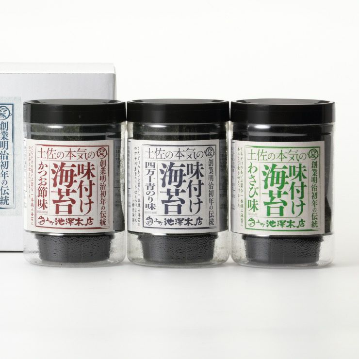 海苔だけで主役になれる味付けとして選んだのが【かつお節】【四万十青のり】【わさび】の3つ。いずれも“それ1枚で十分なおかずになる”しっかりとした味わいです。海苔は健康にも良く、カロリーも少ないので、健康を意識する方の食事やおつまみにも最適。酒どころ高知の老舗魚屋がつくった海苔の新しい解釈をぜひお試しください。
